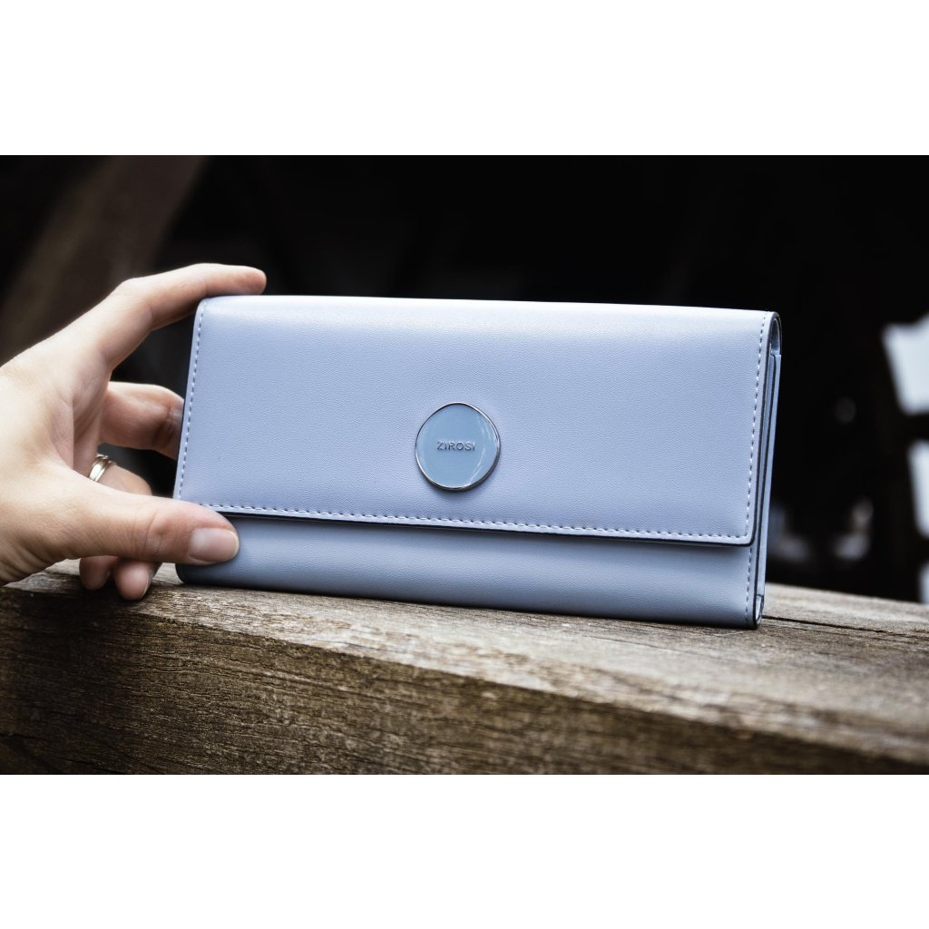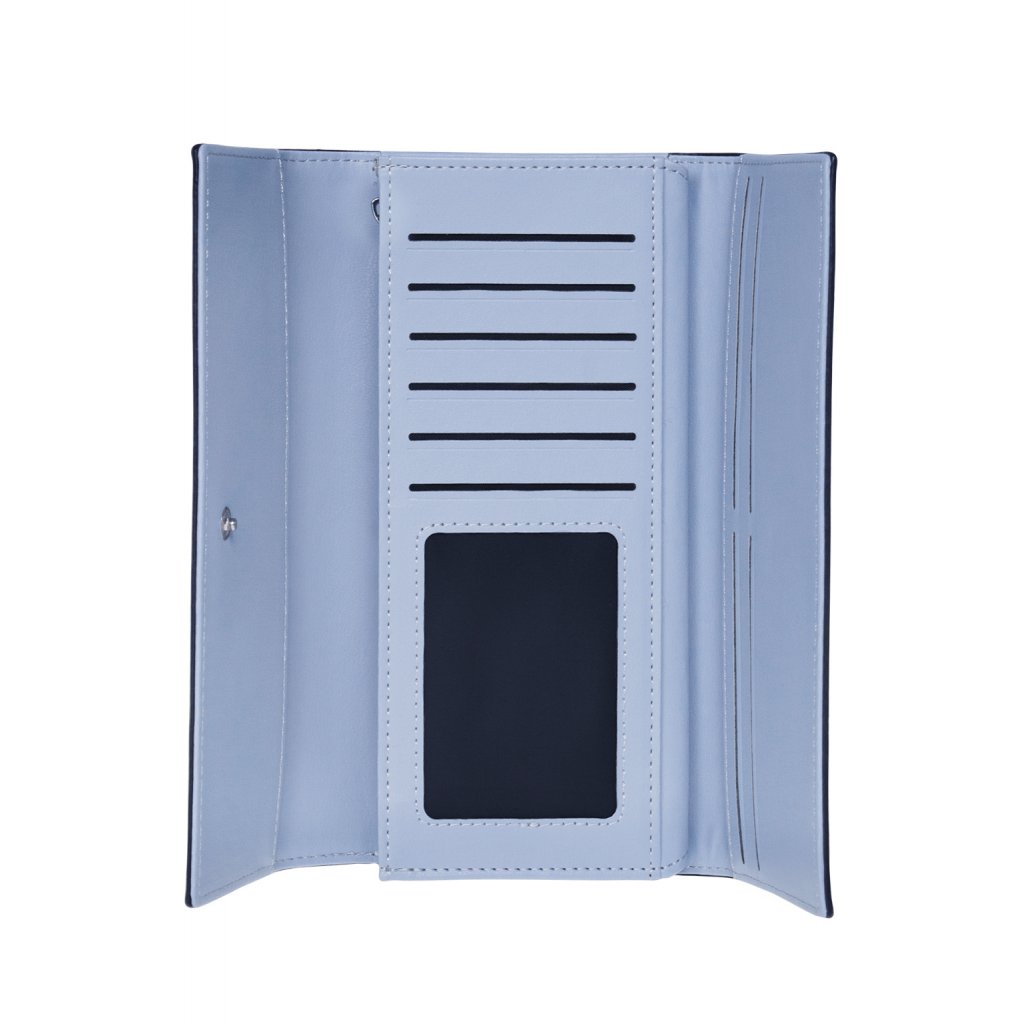 „Toužíte po pěkné peněžence a zároveň stylovém módním doplňku? Ráda se zhostím obou úkolů a pomůžu vám zazářit, v jakékoliv situaci. Mezi mé hlavní domény , patří půvabná barva, připomínající květy pomněnek. Odolný a pevný materiál a také velký formát, díky kterému, dovnitř můžete uložit všechny potřebné dokumenty a cennosti. A ať už si mě vezmete kamkoliv, pokaždé sklidíte mnoho obdivu.“